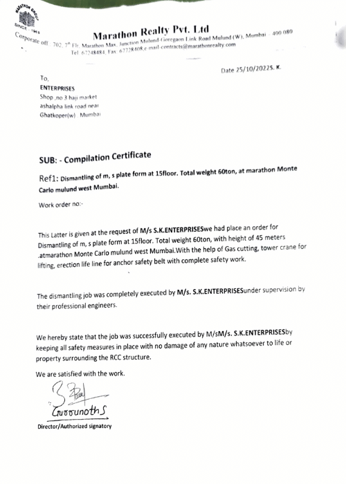 Dismantling of m, s plate form at 15floor. Total weight 60ton, at marathon Monte Carlo mulund west Mumbai.